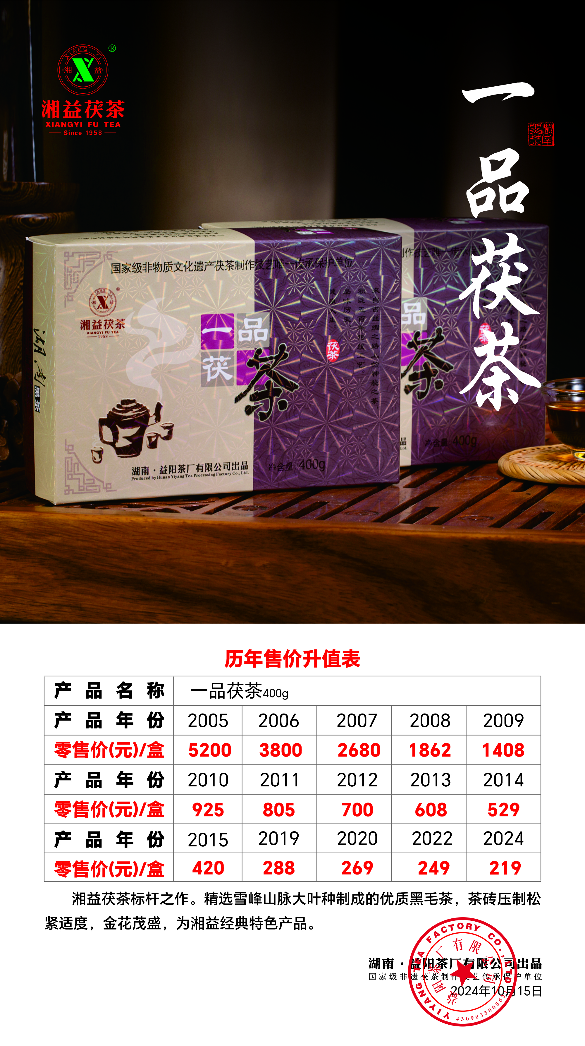 茯茶行業(yè)內(nèi)第一款中高檔產(chǎn)品是我司在2005年開發(fā)出的一品茯茶。它是湖南黑茶里程碑的產(chǎn)品,推動了湖南黑茶的興盛發(fā)展,走在當(dāng)今茯茶品類中的前列。原料選用北緯30°黃金產(chǎn)地雪峰山脈大葉種制成的優(yōu)質(zhì)黑毛茶,并采用改良生產(chǎn)技術(shù)工藝制作,茶磚壓制松緊適度,金花茂盛,菌花香濃,湯色橙紅,為湘益經(jīng)典特色產(chǎn)品。