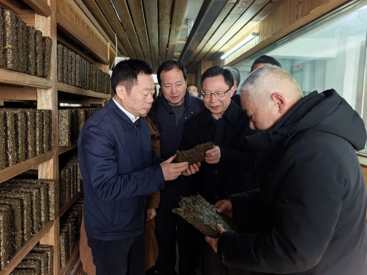 調(diào)研組深入公司一線,實地考察了保障戰(zhàn)略儲備的邊銷茶原料庫、展現(xiàn)智能升級的篩分與壓制車間、關(guān)乎品質(zhì)核心的“金花酵庫”,以及承載歷史文脈的湘益茶博館。何寄華副主席細(xì)致詢問了原料管控、工藝流程、技術(shù)裝備及非遺技藝活態(tài)傳承等情況,對“湘益”品牌近七十載如一日保障邊疆供應(yīng)、促進(jìn)民族團(tuán)結(jié)所作出的歷史性貢獻(xiàn)給予高度評價。